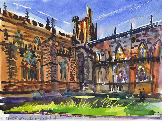 Today was a travel day, moving from Devizes to Chester. We grabbed breakfast at a Subway diner downstairs from our accommodation, then took a bus and two trains, arriving at a dormitory-style place called The Bunkrooms here in Chester after about four hours. I painted the cathedral, this time from a different angle than 13 years ago, capturing its 'L' shape illuminated by the setting sun. It was also a day blessed with sunshine!