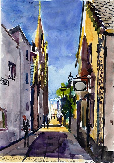 We parted ways after breakfast. My son went to the nearby second-hand book shop. I drew the first large picture with a composition that shows the suspension bridge in the distance, sitting on a bollard-like standing stone.