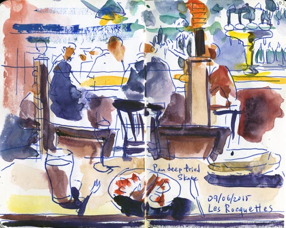 先日夕食を取ったテーブルからバーを挟んで反対側にあるやはり区分けされた片隅に案内されました。フライパンで揚げたスケート(雁木エイ)を注文したのですが、ビールを1パイント飲み終わったころに、配膳されたそれはいつもの扇のような姿に調理されたものでなくロール状の茶色の物体でした。