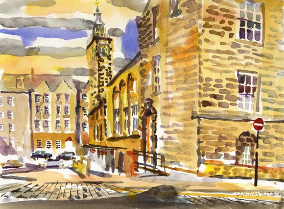 この日の最後の絵はトールブースになりました。私が最初に描いたトールブースは前年に訪れたククーブリのものでした。そしてこの旅ではもう一つ、クレイルで描きました。スコットランドにはたくさんのトールブースがありますが今ではその多くが町の文化の拠点として再活用されています。たぶんこの絵の中ほどにある大きなアーチは楽屋口でしょう。役者らしき人物が煙草を喫いに出てきています。