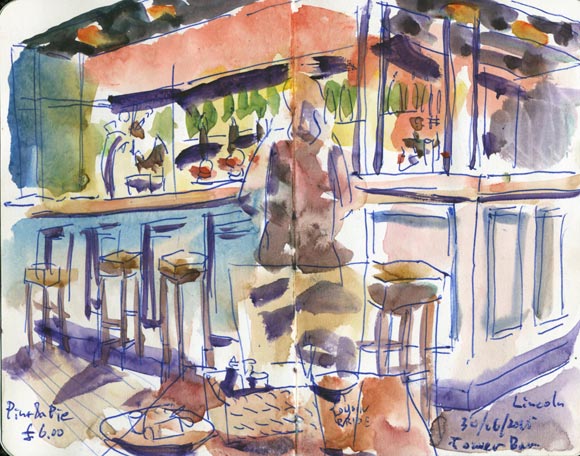 ストラッグラーは食事を出しません。その背後に屹立する給水塔から名前を取ったタワー・ホテルのバーへ行きました。私は給水塔を城と勘違いしていました。翌朝メアリーからそれがビクトリア時代に建てられた給水塔であることを教わりました。私は6ポンドで提供される、パイとパイントのセットメニューに満足しました。