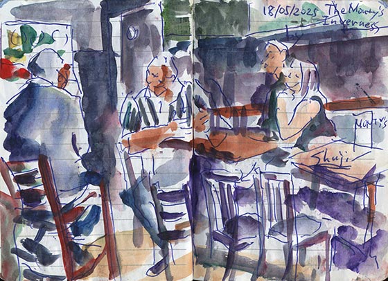 モニカがルーカース駅まで送ってくれました。私たちは列車を2つ乗り継ぎ、インバネスに到着しました。セルフチェックインの始まる4時までザ・モンティーズでビールを飲んで待ちました。ここでジミー・ピアソンと再会しました。パートナーのレスリーはどうやら体調を崩しているいるようです。