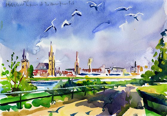 ノース・ケゾックからインバネスのジョンの庭に戻ってくると、ルーマニア人のルーシーと彼女の母親がいました。庭でビールとコーヒーを飲みながら歓談しました彼女らと共にジョンの家を失礼しました。息子はスカイ島へのバスツアーに参加していました。夕食はウィザースプーンで合流する予定でした。時間を潰すために散歩しながらこの絵を描きました。