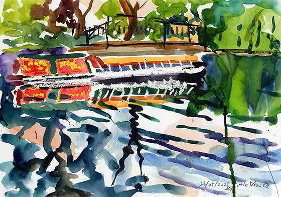 今日は、インバネスからロンドン・キングスクロスまで8時間の列車旅をしました。途中、14の駅をスケッチしました。パディントンのオーチャード・ハウス・ホテルに午後4時半ころチェックインしました。息子はグローブ・シアターに『ロミオとジュリエット』を観に行き、私は近くのリトル・ヴェニスで大きな絵を速画きしました。